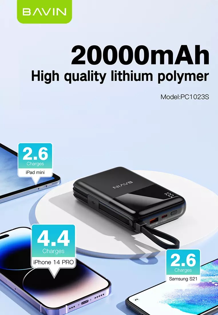 از آنجایی که گوشی تلفن همراه به یکی از ضروری‌ترین وسایل زندگی ما تبدیل شده است، اینکه همیشه شارژ کافی داشته و قابل استفاده باشد، از اهمیت زیادی برخوردار است. پاوربانک‌ها وسایلی هستند که قرار است این امکان را برای ما فراهم کنندپاوربانک 20000 باوین Bavin PC1023S Fast Charge توان 22.5 وات همراه با کابل متصل محصولی جدید از شرکت باوین بوده که به منظور رفع نیاز شما به شارژ گوشی و تبلت در موقعیت‌های مختلف طراحی شده است.