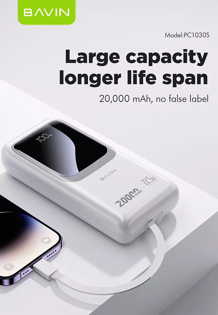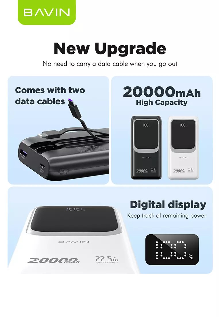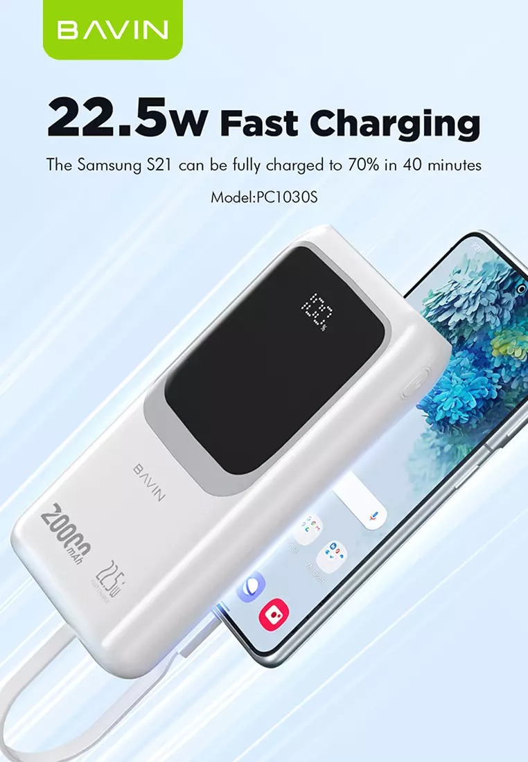 پاوربانک 20000 باوین Bavin PC1030S 20000mAh Fast Charging Powerbank توان 22.5 وات همراه با کابل های متصل تایپ سی و لایتنینگ