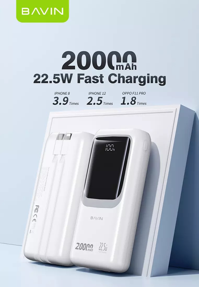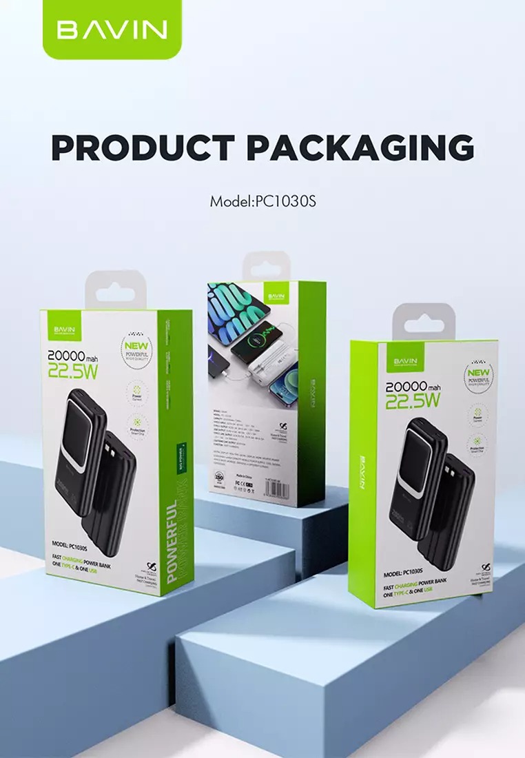 پاوربانک این روزها از ضروری ترین وسایل همراه ما به حساب می آیند. پاوربانک Bavin PC1030S با داشتن 2 پورت خروجی تایپ سی و USB، توان 22.5 وات و ظرفیت اسمی 20000 میلی آمپر ساعت و قابلیت شارژ سریع می تواند همراه خوبی برای شما باشد. داشتن نمایشگر دیجیتالی برای نمایش میزان باتری باقی مانده و 2 کابل متصل (تایپ سی و لایتنینگ) کامل کننده ویژگی های این پاوربانک است.