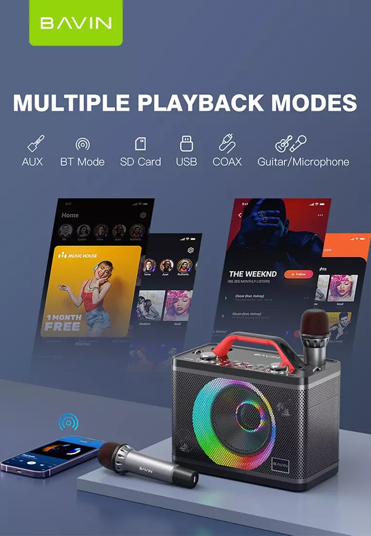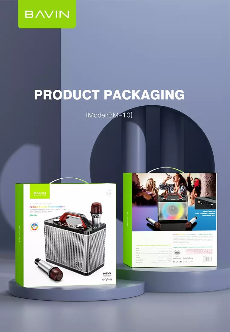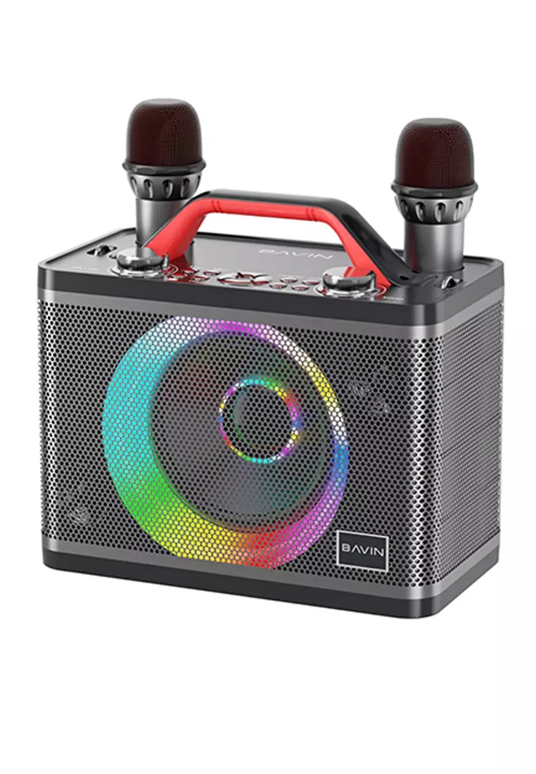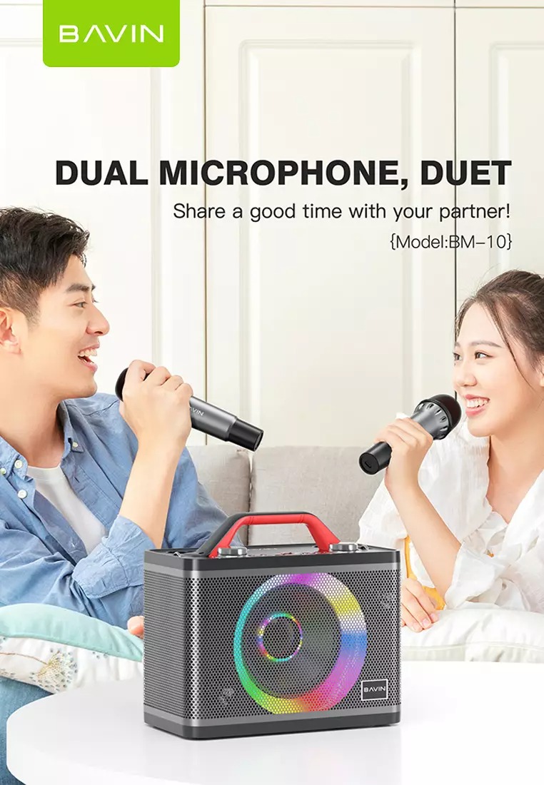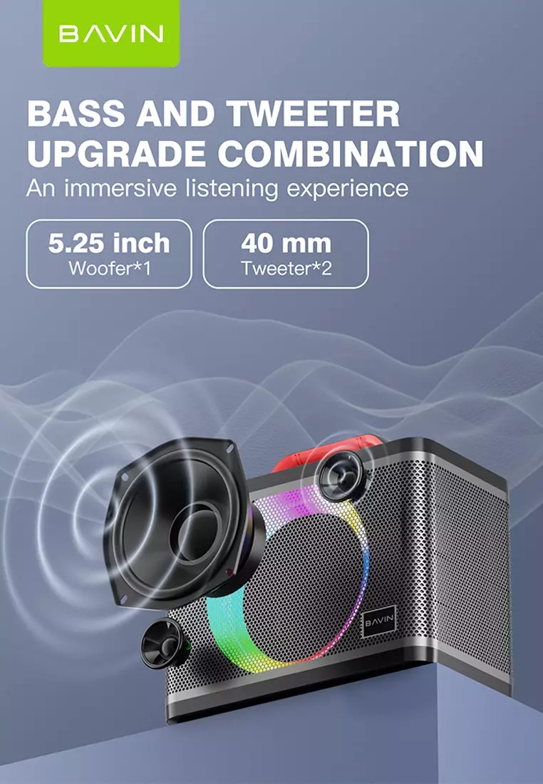 اسپیکر بلوتوث Bavin BM10 دارای یک وُفر 5.25 اینچی قوی و دو توییتر 40 میلیمتری می باشد.علاوه بر پخش با کیفیت موسیقی اسپیکر بلوتوث Bavin BM10 دارای دو میکروفون است که با بلوتوث به اسپیکر متصل شده و می توان از آن برای خواندن و کارائوکه نیز استفاده کرد.