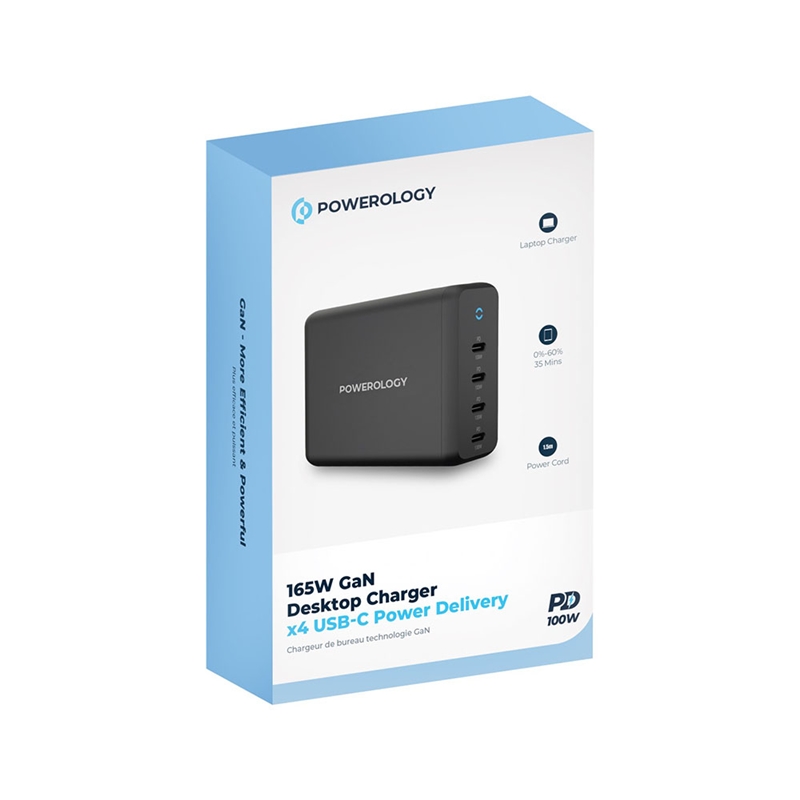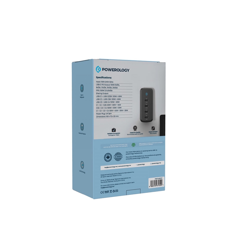شارژر دیواری 165 وات پاورولوژی (Powerology 165W x4 USB-C GaN Charger) با فناوی GaN یک آداپتور کارآمد است که از طریق یک کابل برق 1.5 متری 3 پین UK به پریز برق متصل می شود و ورودی آن با ولتاژ 100 تا 240 ولت سازگار است.