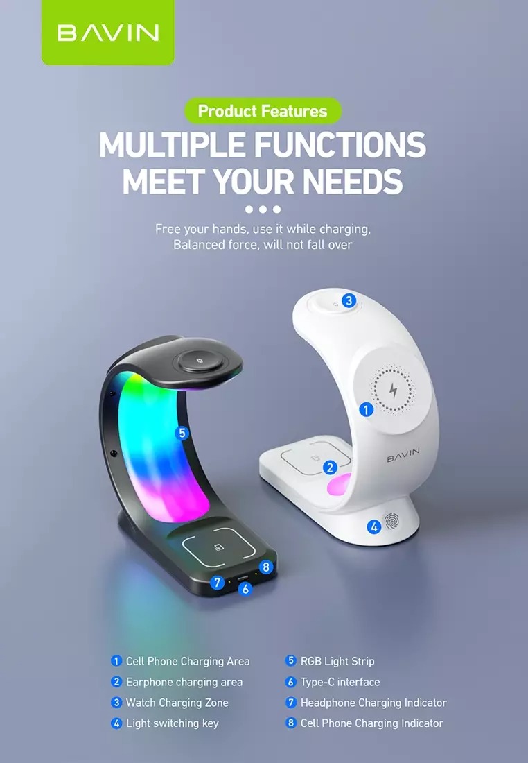 شارژر وایرلس Bavin PC1071 از پلاستیک مقاوم ساخته شده و دارای چند عملکرد مختلف است که به جذابیت این محصول افزوده است. وزن بدنه این شارژر وایرلس 277 گرم و ابعاد 145*147*66 شارژر وایرلس مگنتی برای گوشی آیفون 12 به بعد، شارژر وایرلس معمولی برای هندزفریها و یک قسمت برای شارژ اپل واچ از امکانات این شارژر وایرلس چند کاره است. قسمت مگنتی دارای آهنربای قوی است. بر روی این استند همچنین LED با نورپردازی RGB قرار گرفته است که به خصوص هنگام استفاده در شب زیبایی و جلوه خاصی به استند شارژ باوین PC1071 میبخشد.