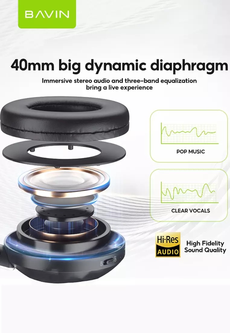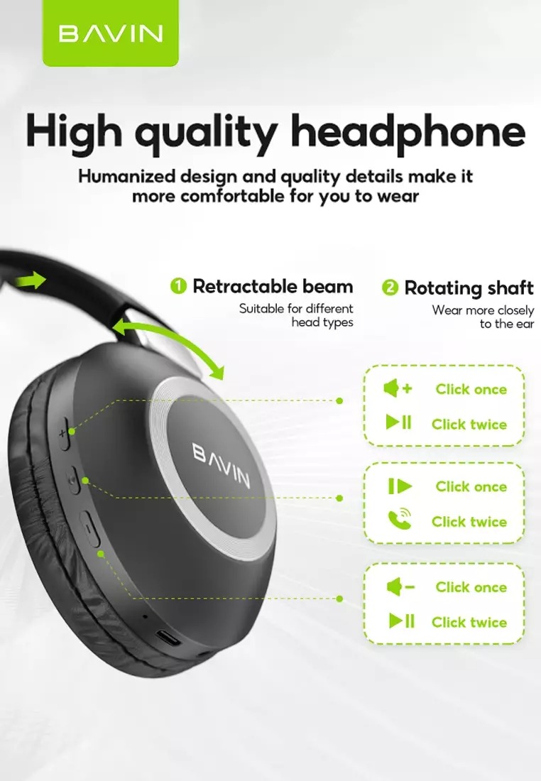 هدفون بلوتوث باوین Bavin BH-37 در وزن 185 گرم ساخته شده است. دارای یک میکروفون داخلی است همچنین هدفون بلوتوثی باوین BH-37 درایور های 40 میلیمتری با بالشتک های بسیار راحت ارائه می شود و از کیفیت صدای استریو پشتیبانی می کند.همچنین اکولایزر ها در حالت سه بانده تنظیم می شوند و تجربه عالی برای شما به ارمغان می آورند. این محصول دارای قابلیت جمع شدن و کمی چرخش است که برای سایز های مختلف قابل استفاده باشد.