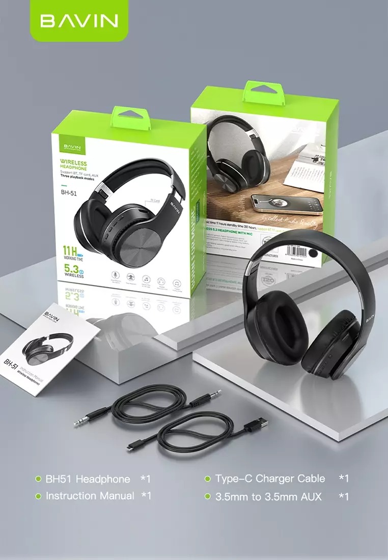 در پکیج هدفون Bavin BH-51 علاوه بر دستگاه یک دفترچه راهنما و یک کابل 32 سانتی متری تایپ C و یک کابل یک متری AUX موجود است.