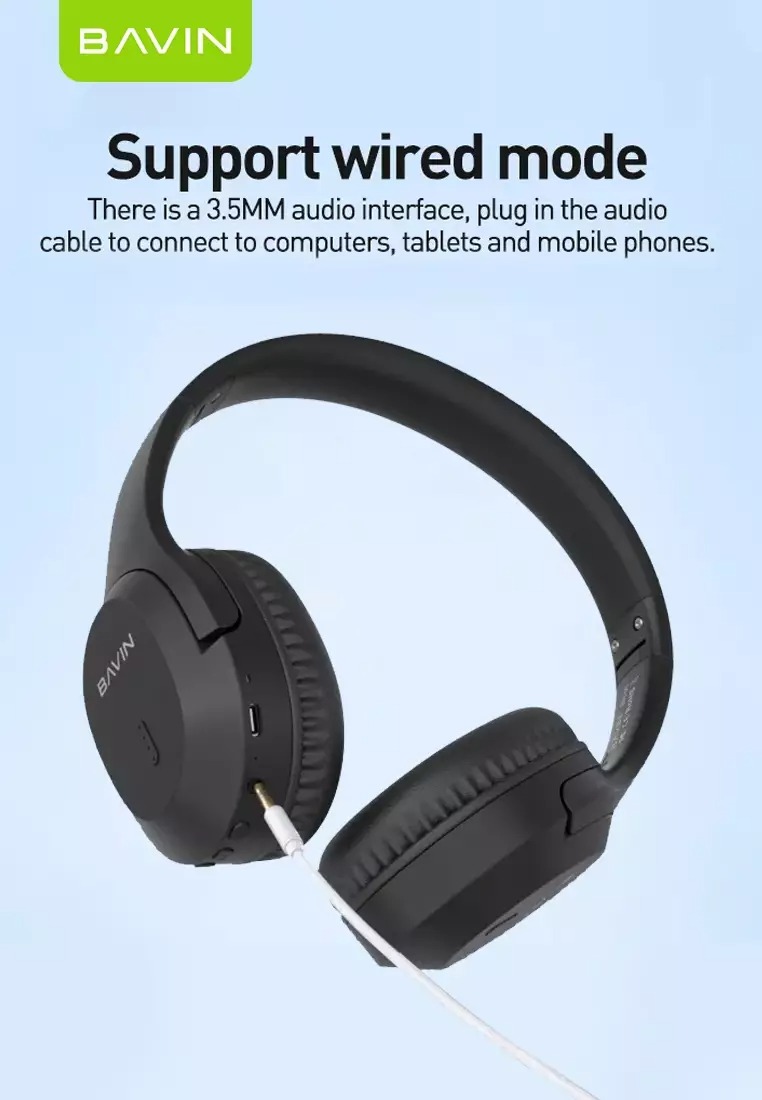 علاوه بر این شما می‌توانید به کمک درگاه جک 3.5 قرار گرفته روی هدفون بلوتوثی Bavin BH-50، هدفون خود را به صورت باسیم نیز به انواع دستگاه‌های متصل کرده و از آن استفاده کنید.