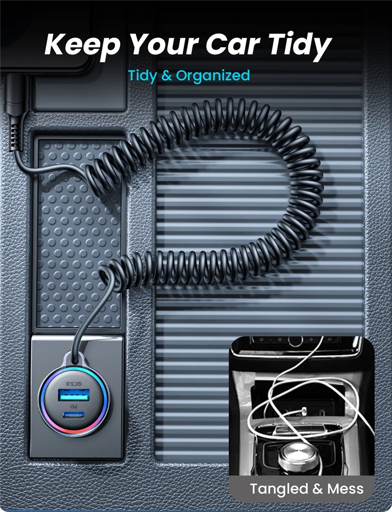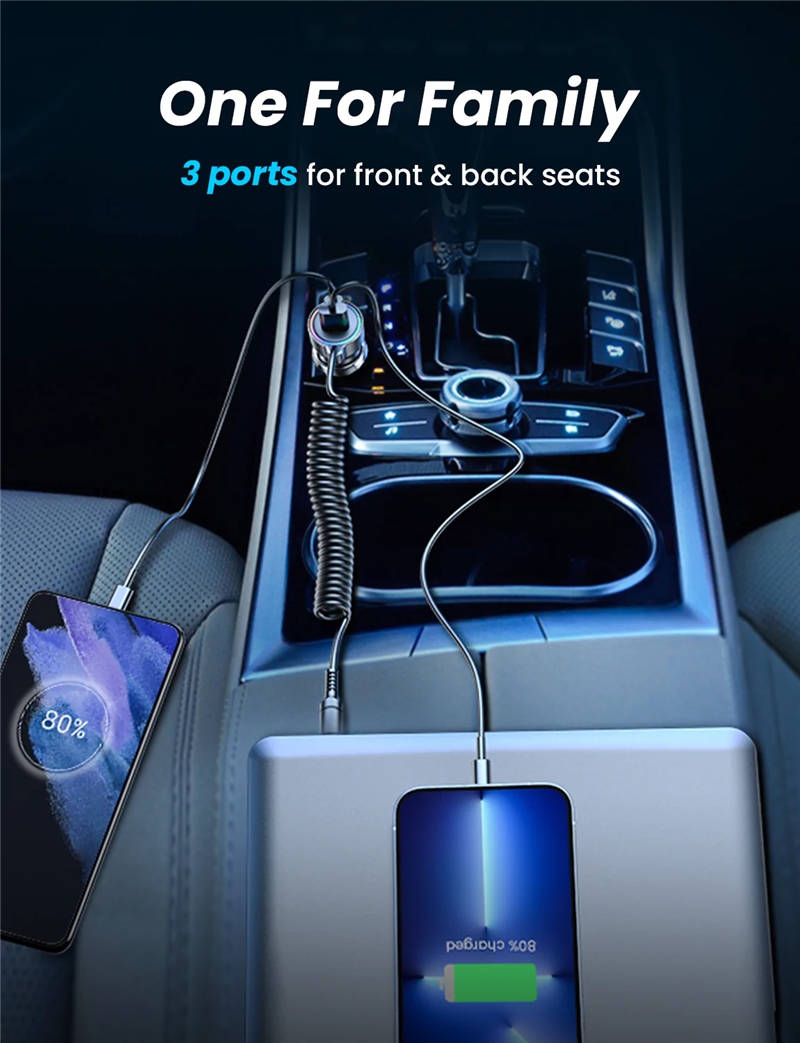 بوده که از خاموش شدن گوشی شما در اتومبیل جلوگیری می کند و به شما این امکان را می دهد تا بتوانید 3 گوشی موبایل را به طور همزمان نیز شارژ کنید. ویژگی این شارژر فندکی داشتن کابل Lightning متصل است. علاوه بر آن سرعت بالا در شارژ کردن گوشی و بهره مندی از QC3.0 ، PD3.0 ، AFC ،PPS، FCP و... است.