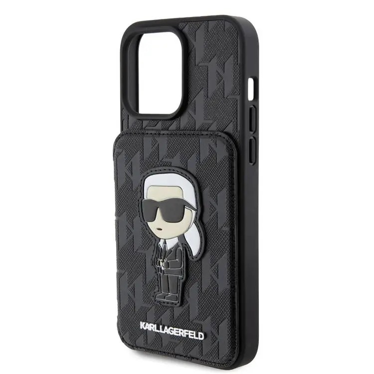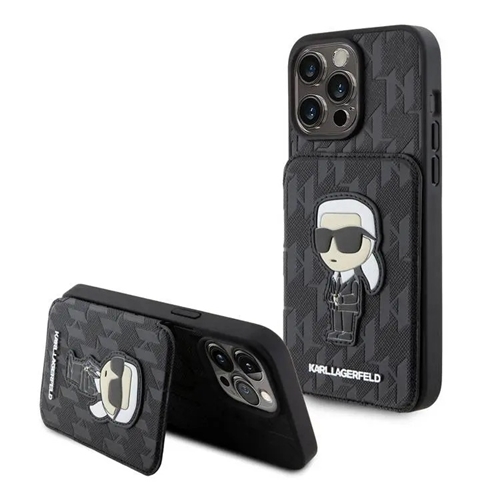قاب برند کارل لاگرفلد اورجینال مدل SAFFIANO MONOGRAM CASE WITH CARDSOLT & STAND مناسب برای گوشی موبایل اپل آیفون 15 پرو