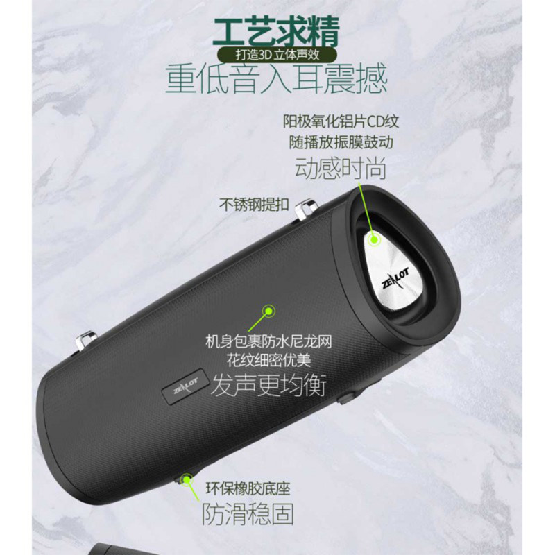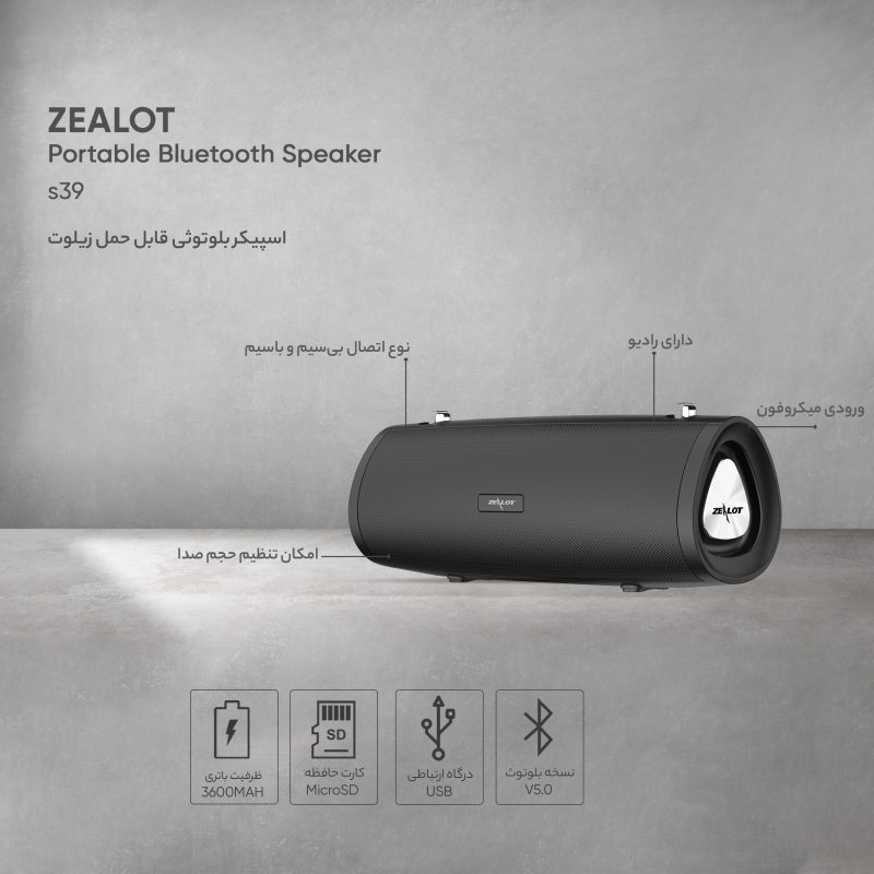 برند Zealot در زمینه ی تولید هدفون و اسپیکر ، کاملا شناخته شده و مطرح است و به خاطر دارا بودن امکانات نوآورانه و کیفیت بالای محصولات و مجهز بودن به تکنولوژیهای روز در سراسر دینا طرفداران زیادی دارد. اسپیکر زیلوت S39 دارای کیفیت ساخت بسیار بالایی است و جزو پرچمداران در این ریج قیمت است. از نظر طراحی و کیفیت متریال به کار رفته ، هیچ کم و کسری ندارد و واقعا حس یک اسپیکر حرفه ای و قوی را منتقل میکند. بدنه از پلاستیک ABS ساخته شده است تا علاوه بر مقاومت به رطوبت ، طول عمر بالایی داشته باشد.در بالای اسپیکر دو گیره برای بند آویز و حمل آسان قرار گرفته است و در زیر اسپکر نیز پایههایی تعبیه شده ، تا نشست آنرا مستحکمتر کند. دکمههای اسپیکر نیز با نورپردازی درونی به رنگ آبی کمرنگ نیز در بالای اسپیکر قرارگرفتهاند که وظایف زیر را به عهده دارند. اسپیکر Zealot S39 دارای صدای فوق العاده ای است که به خاطر وجود 2 اسپیکر درونی 5 واتی و یک ساب ووفر 18 واتی است که علاوه بر اینها درون اسپیکر از یک چیپست بهبود کیفیت صدا نیز استفاده شده است که حتی در بالاترین سطح صدا ، صدای واضح و با کیفیت را تجربه کنید. مجموع توان خروجی 28 واتی ، این اسپیکر را برای استفاده برای فضای باز نیز قابل استفاده کرده است. صدای S39 به معنای واقعی فوقالعاده و با کیفیت است که میتوان از وضوح صدا ، تفکیک بالا و بلندی مناسب آن لذت برد. قابلیت TWS این امکان را فراهم میکند تا بتوانید دو اسپیکر را به صورت بیسیم به هم متصل و Sync کنیدو از این طریق به صورت همزمان از دو اسپیکر استفاده کنید. زیلوت اس39 مجهز به یک میکروفون قوی است که میتوان از طریق آن به مدیریت تماسها پرداخت و از طریق اسپیکر مکالمه کرد. درون این اسپیکر یک باطری 3600 میلی آمپری بسیار قوی وجود دارد که قابلیت پاوربانک هم دارد و شما میتوانید در صورت نیاز به عنوان مثال ، موبالتان را شارژ کنید.
