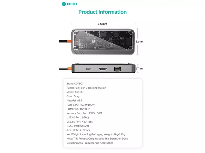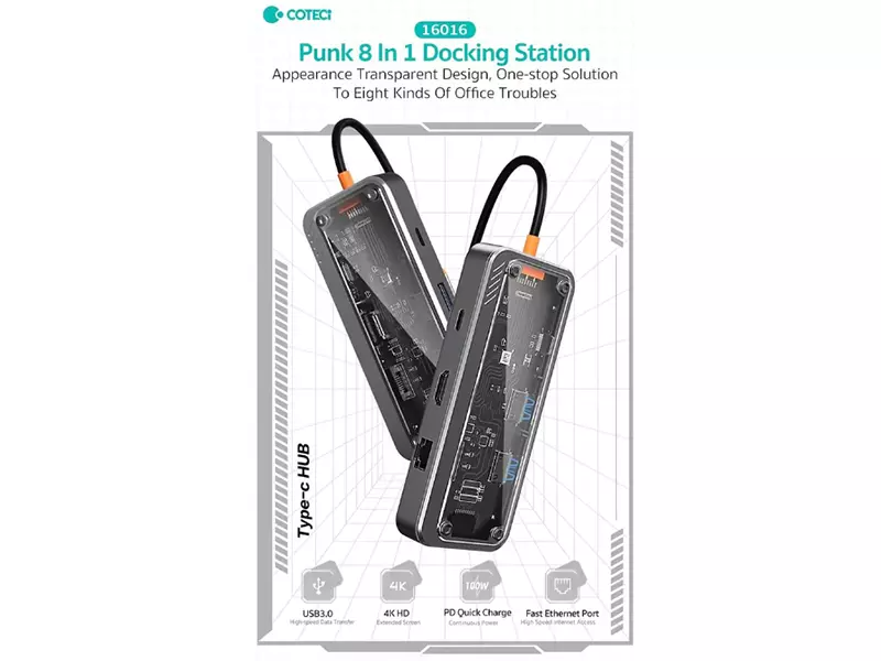 هاب تایپ سی 8 پورت شفاف کوتتسی Coteetci 8 IN 1 MULTIFUNCTIONAL DOCKING STATION 16016
