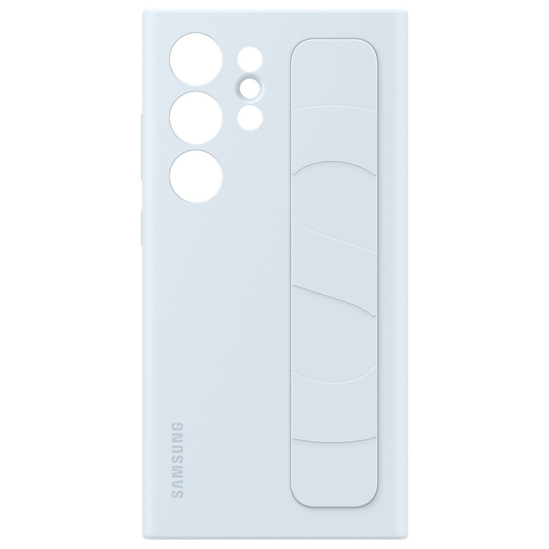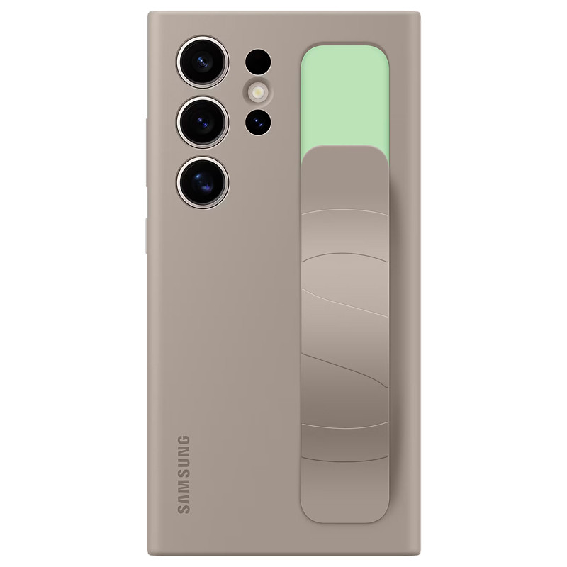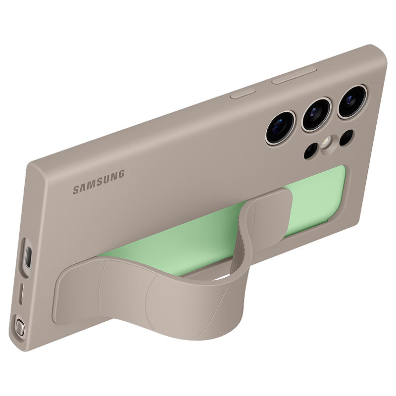 قاب سیلیکونی اورجینال Grip Case سامسونگ دارای یک بند در قسمت پشتی بدنه خود است تا گوشی همراه خود را به صورت ایمن در دست بگیرید. بند محکمی که در این قسمت به صورت ایستاده تعبیه شده مانند یک سکو محکم عمل می کند که نگرانی شما را از بابت لیز خوردن اتفاقی گوشی از دست بر طرف خواهد کرد. البته این تنها قابلیتی نیست که این بند به ظاهر ساده برایتان فراهم خواهد کرد، با وجود این بند می توانید گوشی را روی میز و سایر سطوح صاف تکیه داده و از آن به عنوان یک استند استفاده کنید. از مزیت های این قاب که بگذریم به جنس آن می رسیم، شرکت سازنده در ساخت قاب از متریال سیلیکونی استفاده کرده که بافت آن مانند ابرشیم صاف و یکدست است. این صاف و نرم بودن سطح قاب مخصوصا هنگامی که قرار است ساعت های طولانی گوشی موبایل را در دست بگیرید یک مزیت محسوب می شود.
