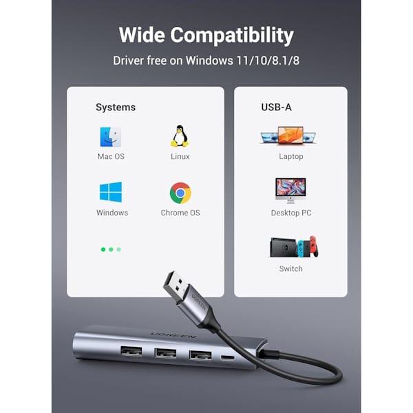 هاب 5 پورت USB 3.0 یوگرین مدل CM266 کد 60812 با طیف وسیعی از دستگاههای دارای پورت USB سازگار است. به این ترتیب، میتوانید از آن با اکثر دستگاههای مدرن خود بدون هیچ مشکلی استفاده کنید.