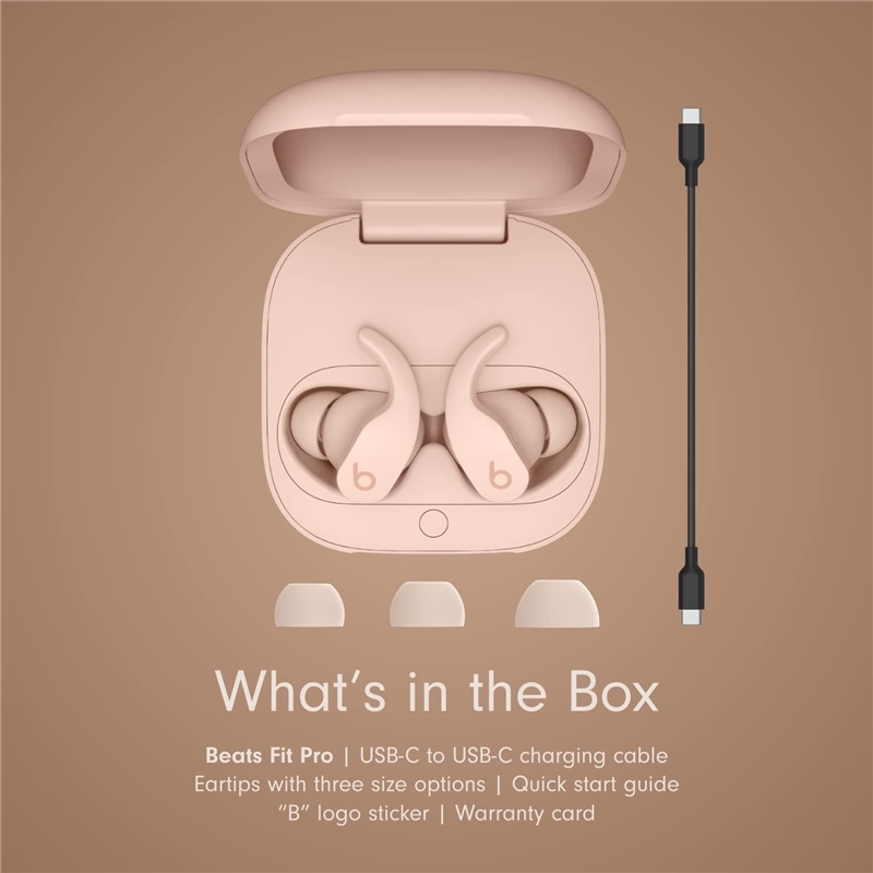 در جعبه، Earbuds Beats Fit Pro، یک کیف شارژ جیبی، گوشوارههایی با سه گزینه اندازه، یک کابل شارژ USB-C به USB-C، یک راهنمای شروع سریع و یک کارت گارانتی پیدا خواهید کرد.