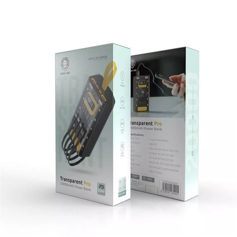 این پاوربانک نوآورانه، با کابل های یکپارچه، برای شارژ نگه داشتن اسبابک های شما در حالی که در جاده هستید ساخته شده است. شما می توانید به لطف طراحی شفاف، کارهای داخلی را مشاهده کنید، که آن را نیز مد روز جلوه می دهد. با فناوری شارژ سریع PD 20W، این پاوربانک نرخ شارژ سوئیفت را به صورت پیکانی ارائه میکند و تضمین میکند که گجتهای شما در کمترین زمان شارژ میشوند. پاوربانک Green Lion می تواند گوشی هوشمند، تبلت و سایر گجت های مجهز به USB شما را شارژ کند. شما به سادگی می توانید سطح انرژی را کنترل کنید زیرا صفحه نمایش LED پاوربانک اطلاعاتی را در زمان واقعی در مورد ظرفیت باقی مانده باتری ارائه می دهد. 4 خروجی این پاوربانک به شما امکان می دهد چندین دستگاه را به طور همزمان شارژ کنید و برای افرادی که دائما در حال حرکت هستند یا با دوستان و خانواده در سفر هستند ایده آل است. کابل های یکپارچه، حمل سیم های شارژ اضافی را غیر ضروری می کند، که راحت است و ضایعات را کاهش می دهد. برای کسانی که به دنبال شارژ سریع، سازگاری، و طراحی شیک هستند.
