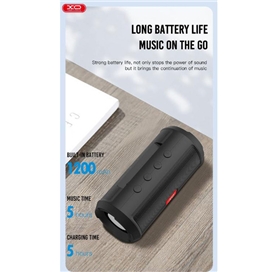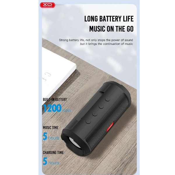باتری داخل اسپیکر بلوتوث XO F23 ظرفیتی معادل 1200 میلی آمپر ساعت دارد و با هر بار شارژکه حدود 5 ساعت زمان لازم دارد؛ میتواند حدود 5 ساعت با به پخش موسیقی بپردازد. که این میزان در محیط آزمایشگاهی بدست آمده است. البته عددی که گفته شد، به طور میانگین است، در حقیقت این عدد کاملا وابسته به میزان حجم صدایی است که شما با آن به موسیقی گوش خواهید داد.