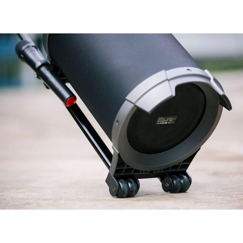 در هنگام نگاه کردن به RB X6 احتمالاً اولین چیزی که توجهات را به خود منعطف می کند، ظاهر بزرگ آن است. این بلندگو استوانه ای ابعادی حدود 48x26x32 سانتی متر با وزنی نزدیک به 6.4 کیلوگرم دارد. از آنجایی که جزء دسته اسپیکرهای فضای باز قرار می گیرد پس جا به جایی آن کار راحتی نخواهد بود. برای حل این مشکل شرکت ریمکس در پایین آن چهار چرخ کوچک به همراه دستگیره ای در بالا قرار داده است؛ همانند چمدان های مسافرتی یا چرخ دستی این دستگیره باز و جمع می شود.
