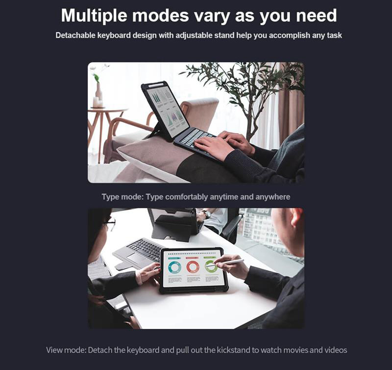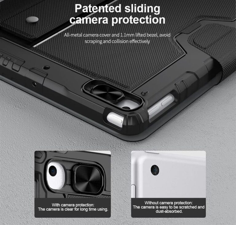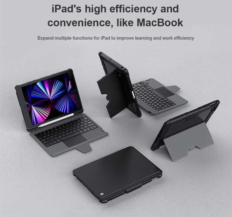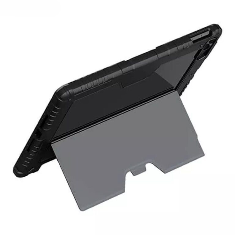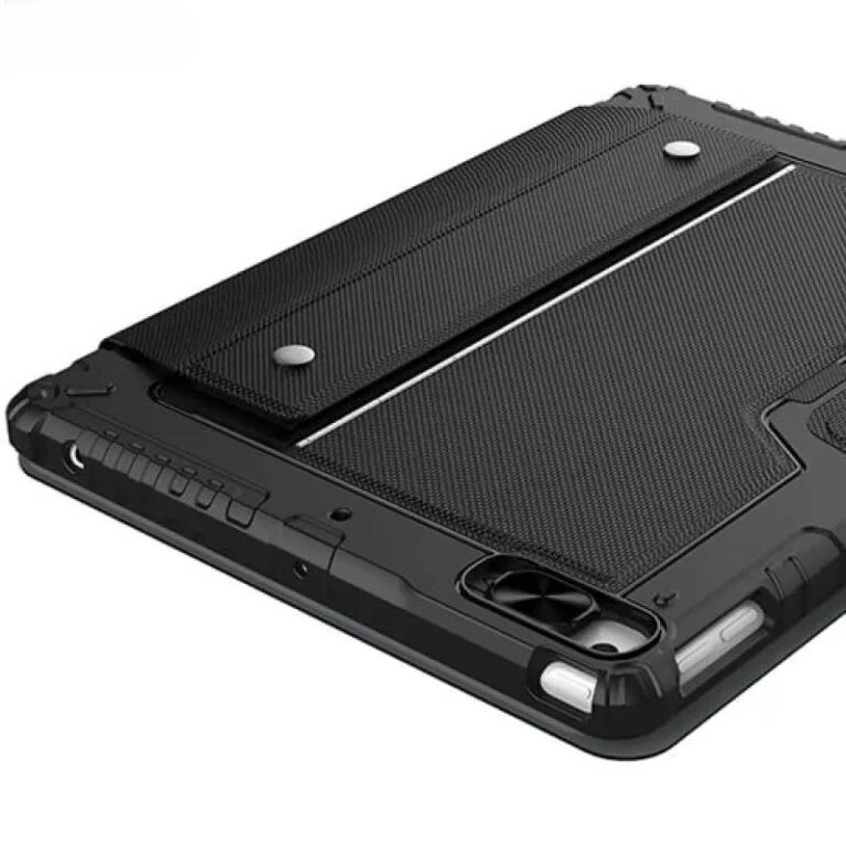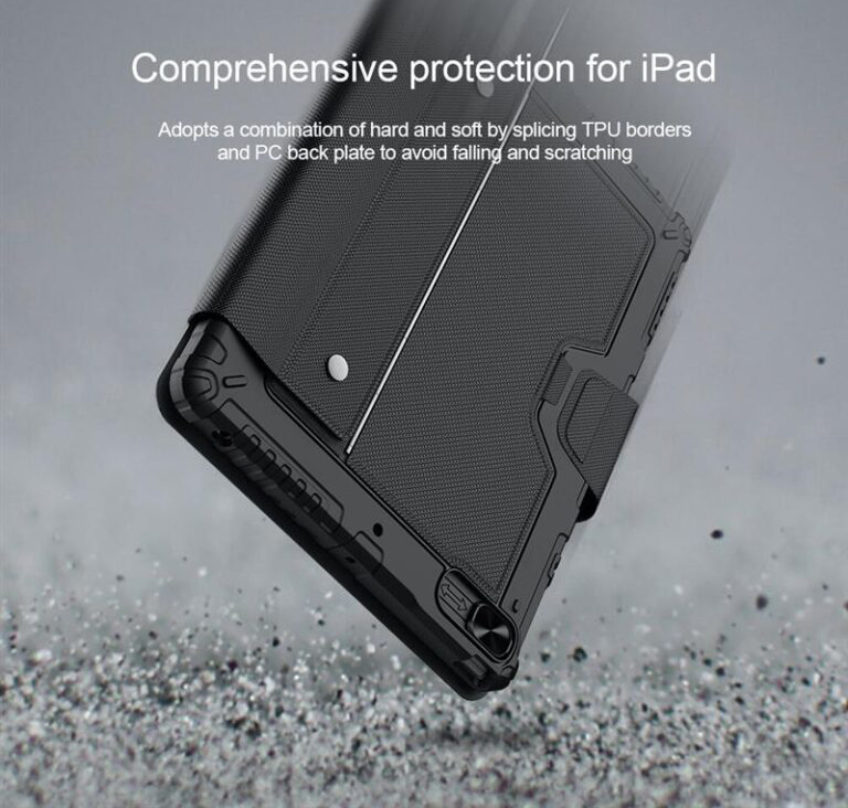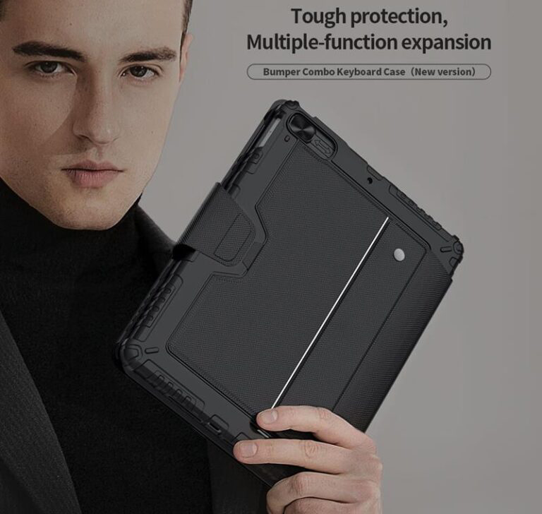 کیف کلاسوری نیلکین مدل New Combo Keyboard یک کیف محافظ و مقاوم است که دارای یک کیبورد با کیفیت نیز میباشد که با استفاده از آن می توانید به کارهای روزمره بپردازید.این کیف کلاسوری دور تا دور بدنه دستگاه را میپوشاند.این کیف دارای مقاومت بالای بوده و در برابر ضربه مقاوم است.البته به این معنی نبوده که در برابر ضربات شدید نیز مقاوم است.جنس این کاور ازTPUوPCساخته شده که دارای مقاومت بالایی می باشد.این کیف کلاسوری دارای محافظ دوربین بوده که به صورت کشویی عمل میکند.یکی از قابلیت های مفید در قاب تبلت ها داشتن استند است؛چون این دستگاه ها ابعاد بزرگی دارند و نگهداری از آنها روی استند بسیار راحت تر و کم خطر تر است.از همین رو کیف کلاسوری دارای یک استند تاشو است که استحکام کافی برای نگهداشتن و استفاده از تبلت را خواهد داشت.شما می توانید حالت های مختلفی برای قرار گرفتن تبلت انتخاب کنید.این استند قابلیت تنظیم زاویه بین 110تا180درجه را دارد.این محصول نیلکین دارای یک کیبورد یا صفحه کلید قابل جدا شدن می باشد.شما در صورت نیاز می توانید از این کیبورد استفاده کرده و یا آن را جدا کنید.کلیدهای این کیبورد به گونهای(قطرهای)طراحی شده که قالب انگشتان شما باشد.این کلیدها بسیار بی صدا بوده و وزن پایینی دارد؛بعلاوه کار با آن شما را خسته نمیکند.کلیدهای کیبورد کیف کلاسوری بسیار حساس بوده و با کمترین فشار عمل خواهد کرد.بر روی این کیبورد یک پد لمسی وجود دارد که می توانید از آن به جای موس استفاده کنید.شما می توانید از طریق بلوتوث این کیبورد را به دستگاه خود متصل کنید.نرخ نمونه برداری لمسی پد لمسی آن120هرتز بوده که بسیار حساس بوده و از چند لمس همزمان پشتیبانی می کند.این کیبورد دارای یک باتری150میلی آمپر ساعتی بوده که برای پر شدن آن نیاز به حدود1.5تا2ساعت شارژ بوده و با پر بودن شارژ تا30روز می توانید از آن استفاده کنید؛البته این عدد برای روزی2ساعت کار با کیبورد است که متناسب با استفاده شما متغییر خواهد شد.قابل ذکر است نسخه بلوتوث این کیبورد3.0می باشد و محدوده عملکرد آن حدود10متر است.در قسمت جلویی این قاب، جای برای قرار گرفتن قلم هوشمند اپل تعبیه شده که می توانید قلم خود را در این قسمت ها قرار دهید. با قرار گرفتن قلم در قسمت جلویی تعبیه شده در تبلت، می توانید قلم خود را به صورت وایرلس شارژ کنید.