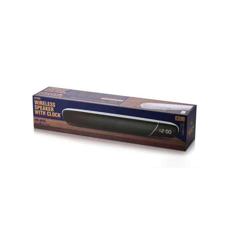 اسپیکر بلوتوث RB-M36 از تولیدات کمپانی ریمکس بوده و در کنار ویژگیهای فنی مشخص به دلیل طراحی منحنی و زیبایی که دارد نظر کاربران زیادی را به خود جلب کرده است. این اسپیکر به دلیل داشتن نمایشگر دیجیتال، علاوه بر پخش صدا میتواند به عنوان ساعت رو میزی نیز استفاده شود. ماده اصلی در ساخت بدنه اسپیکر ABS با کیفیت بوده و مش فیلتر آن از جنس فلز میباشد.
