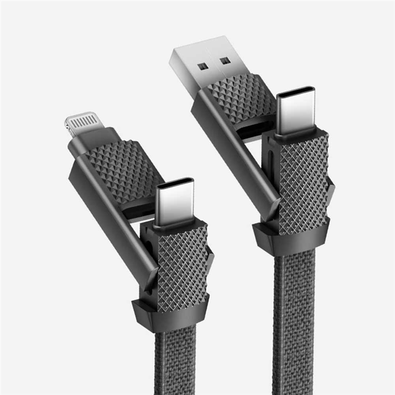 ۴ نوع کانکتور قابل تعویض: این کابل با داشتن ۴ کانکتور مختلف (USB-C به Lightning، USB-C به USB-C، USB-A به Lightning، و USB-A به USB-C) قابلیت شارژ دستگاه‌های مختلف شما را فراهم می‌کند. این ویژگی باعث می‌شود تا نیازی به حمل چندین کابل برای دستگاه‌های مختلف نداشته باشید.