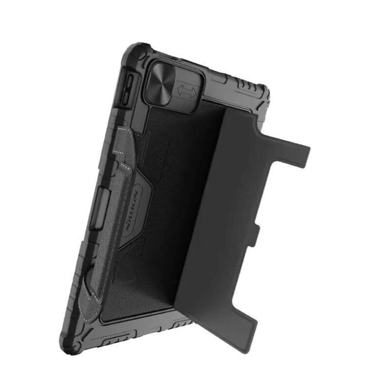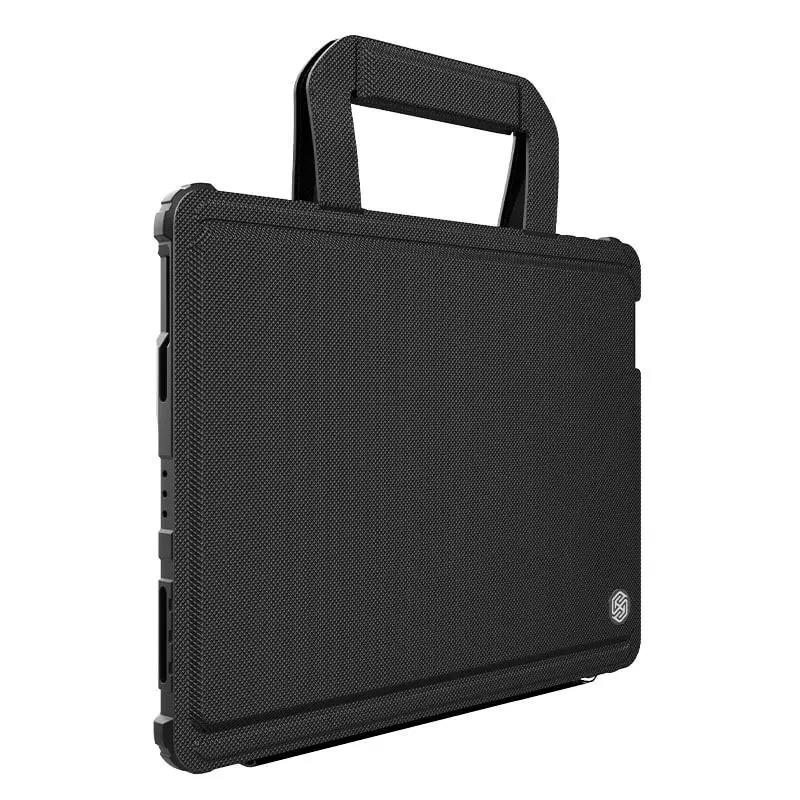 کیف کلاسوری نیلکین مدلBumper Go Keyboard یک کیف محافظ و مقاوم است که دارای یک کیبورد با کیفیت نیز میباشد که با استفاده از آن می توانید به کارهای روزمره بپردازید. تفاوت این مدل با Bumper معمولی دسته ی محکم بالای کیف است که حمل آن را آسان تر میکند. این کیف کلاسوری دور تا دور بدنه دستگاه را میپوشاند.این کیف دارای مقاومت بالای بوده و در برابر ضربه مقاوم است.البته به این معنی نبوده که در برابر ضربات شدید نیز مقاوم است.جنس این کاور ازTPUوPCساخته شده که دارای مقاومت بالایی می باشد.این کیف کلاسوری دارای محافظ دوربین بوده که به صورت کشویی عمل میکند.یکی از قابلیت های مفید در قاب تبلت ها داشتن استند است؛چون این دستگاه ها ابعاد بزرگی دارند و نگهداری از آنها روی استند بسیار راحت تر و کم خطر تر است.از همین رو کیف کلاسوری دارای یک استند تاشو است که استحکام کافی برای نگهداشتن و استفاده از تبلت را خواهد داشت.شما می توانید حالت های مختلفی برای قرار گرفتن تبلت انتخاب کنید.این محصول نیلکین دارای یک کیبورد یا صفحه کلید قابل جدا شدن می باشد.شما در صورت نیاز می توانید از این کیبورد استفاده کرده و یا آن را جدا کنید.کلیدهای این کیبورد به گونهای(قطرهای)طراحی شده که قالب انگشتان شما باشد.این کلیدها بسیار بی صدا بوده و وزن پایینی دارد؛بعلاوه کار با آن شما را خسته نمیکند.کلیدهای کیبورد کیف کلاسوری بسیار حساس بوده و با کمترین فشار عمل خواهد کرد.بر روی این کیبورد یک پد لمسی وجود دارد که می توانید از آن به جای موس استفاده کنید.شما می توانید از طریق بلوتوث این کیبورد را به دستگاه خود متصل کنید.نرخ نمونه برداری لمسی پد لمسی آن120هرتز بوده که بسیار حساس بوده و از چند لمس همزمان پشتیبانی می کند.این کیبورد دارای یک باتری150میلی آمپر ساعتی بوده که برای پر شدن آن نیاز به حدود1.5تا2ساعت شارژ بوده و با پر بودن شارژ تا30روز می توانید از آن استفاده کنید؛البته این عدد برای روزی2ساعت کار با کیبورد است که متناسب با استفاده شما متغییر خواهد شد.قابل ذکر است نسخه بلوتوث این کیبورد3.0می باشد و محدوده عملکرد آن حدود10متر است.در قسمت جلویی این قاب، جای برای قرار گرفتن قلم هوشمند اپل تعبیه شده که می توانید قلم خود را در این قسمت ها قرار دهید.