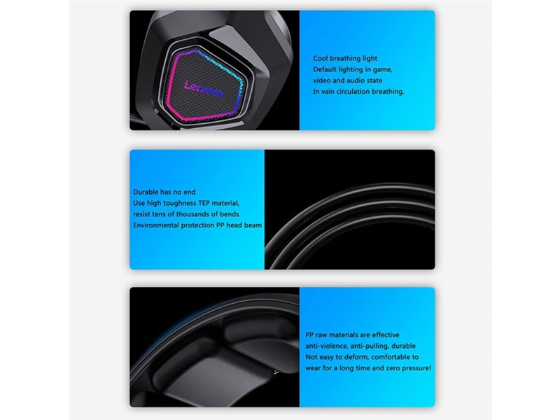لنوو برای هدفون Lenovo thinkplus G50A در قسمت بیرونی نیز از چراغ RGB LED چند رنگ استفاده شده تا حالت گیمینگ هدفون کاملا مشخص باشد. هد تقریبا نرمی با موادی از جنس PP در نظر گرفته که به سر فشار نمی آورد و حالت خود را از دست نمی دهد. شما میتوانید اندازه هدفون را تغییر دهید تا کاملا متناسب با سرتان باشد. برای دوام بیشتر در این قسمت از متریال فلزی استفاده است.