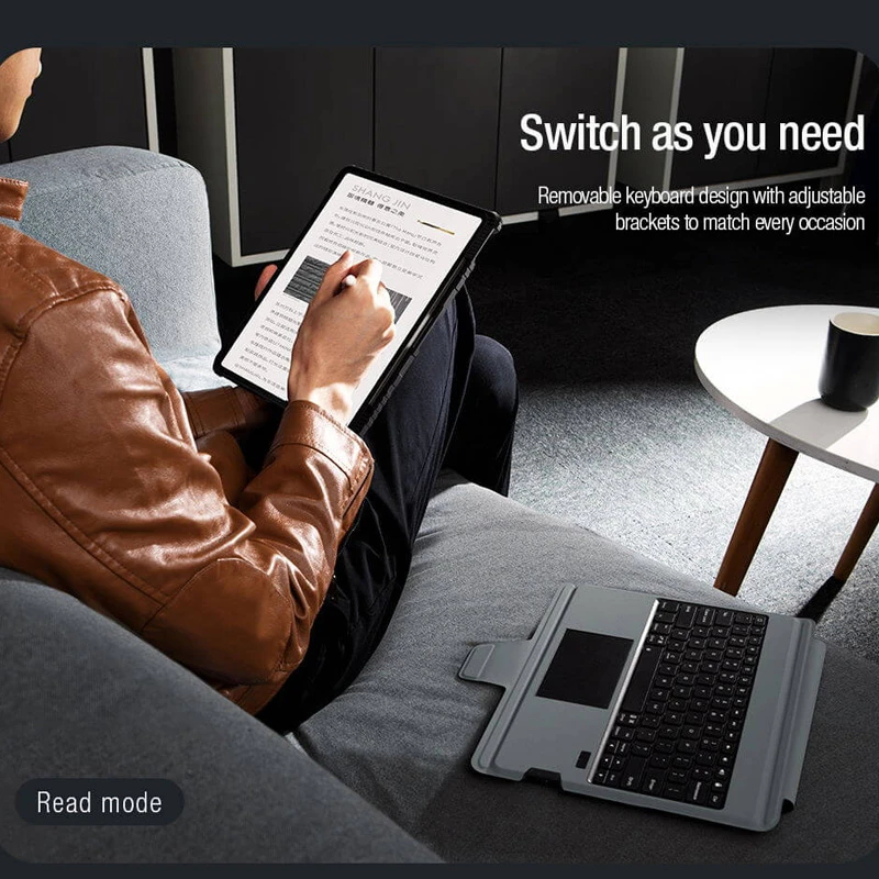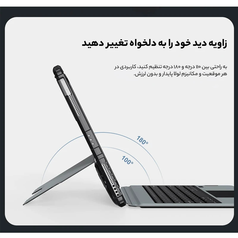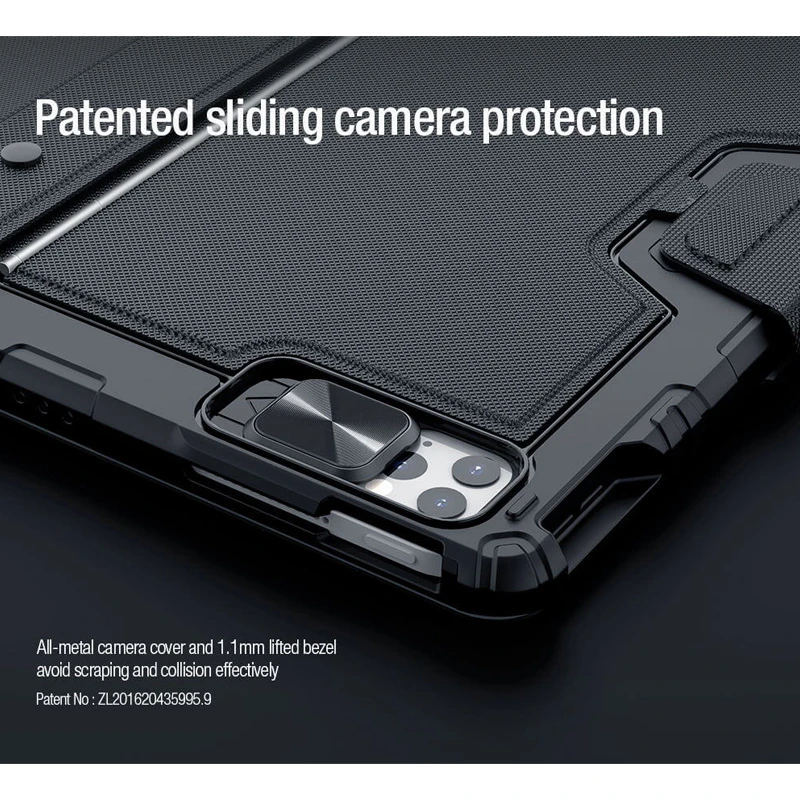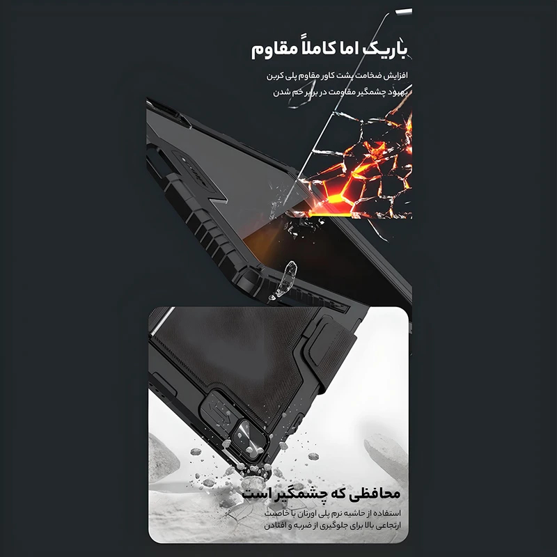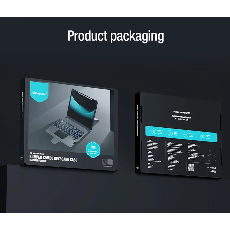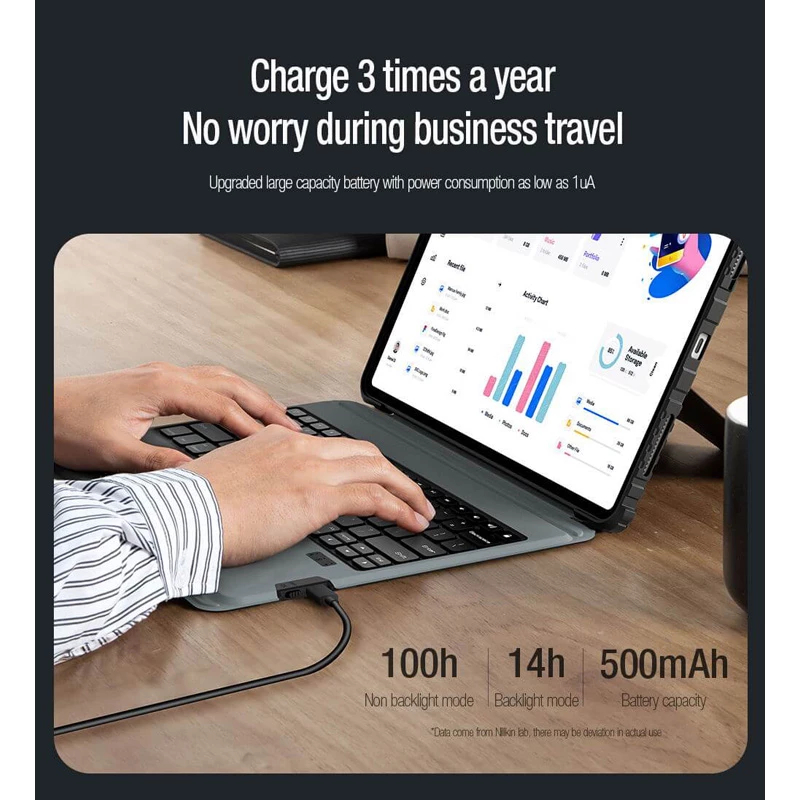 کیف کلاسوری نیلکین مدل Bumper Combo Backlit Keyboard جدیدترین نسخه Combo Keyboard اواخر سال 2023 می باشد که در مدل Backlit علاوه بر ویژگی های نسخه قبلی ویژگی نور پس زمینه در کیبورد با 7 رنگ متفاوت به آن اضافه شده که دیگر در فضای کم نور و یا شب به راحتی میتوانید از کیبورد استفاده کنید و دیگر دغدغه نور هنگام تایپ کردن را نداشته باشید.جنس این کاور ازTPUوPCساخته شده که دارای مقاومت بالایی می باشد.این کیف کلاسوری دارای محافظ دوربین بوده که به صورت کشویی عمل میکند.یکی از قابلیت های مفید در قاب تبلت ها داشتن استند است؛چون این دستگاه ها ابعاد بزرگی دارند و نگهداری از آنها روی استند بسیار راحت تر و کم خطر تر است.از همین رو کیف کلاسوری دارای یک استند تاشو است که استحکام کافی برای نگهداشتن و استفاده از تبلت را خواهد داشت.شما می توانید حالت های مختلفی برای قرار گرفتن تبلت انتخاب کنید.این استند قابلیت تنظیم زاویه بین 110تا180درجه را دارد.این محصول نیلکین دارای یک کیبورد قابل جدا شدن می باش .شما در صورت نیاز می توانید از این کیبورد استفاده کرده و یا آن را جدا کنید.کلیدهای این کیبورد به گونهای(قطرهای)طراحی شده که قالب انگشتان شما باشد.این کلیدها بسیار بی صدا بوده و وزن پایینی دارد؛بعلاوه کار با آن شما را خسته نمیکند.کلیدهای کیبورد کیف کلاسوری بسیار حساس بوده و با کمترین فشار عمل خواهد کرد.بر روی این کیبورد یک پد لمسی وجود دارد که می توانید از آن به جای موس استفاده کنید.شما می توانید از طریق بلوتوث این کیبورد را به دستگاه خود متصل کنید.نرخ نمونه برداری لمسی پد لمسی آن120هرتز بوده که بسیار حساس بوده و از چند لمس همزمان پشتیبانی می کند.این کیبورد دارای یک باتری5000میلی آمپر ساعتی بوده که برای پر شدن آن نیاز به حدود 3 ساعت شارژ بوده و با پر بودن شارژ تا100 ساعت می توانید از آن استفاده کنید؛البته این عدد برای روزی2ساعت کار با کیبورد است که متناسب با استفاده شما متغییر خواهد شد.قابل ذکر است نسخه بلوتوث این کیبورد3.0می باشد و محدوده عملکرد آن حدود10متر است.در قسمت جلویی این قاب، جای برای قرار گرفتن قلم هوشمند اپل تعبیه شده که می توانید قلم خود را در این قسمت ها قرار دهید. با قرار گرفتن قلم در قسمت جلویی تعبیه شده در تبلت، می توانید قلم خود را به صورت وایرلس شارژ کنید.
